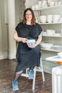 porträtt på en glad keramiker. Pernilla Wetzel i sin atelje