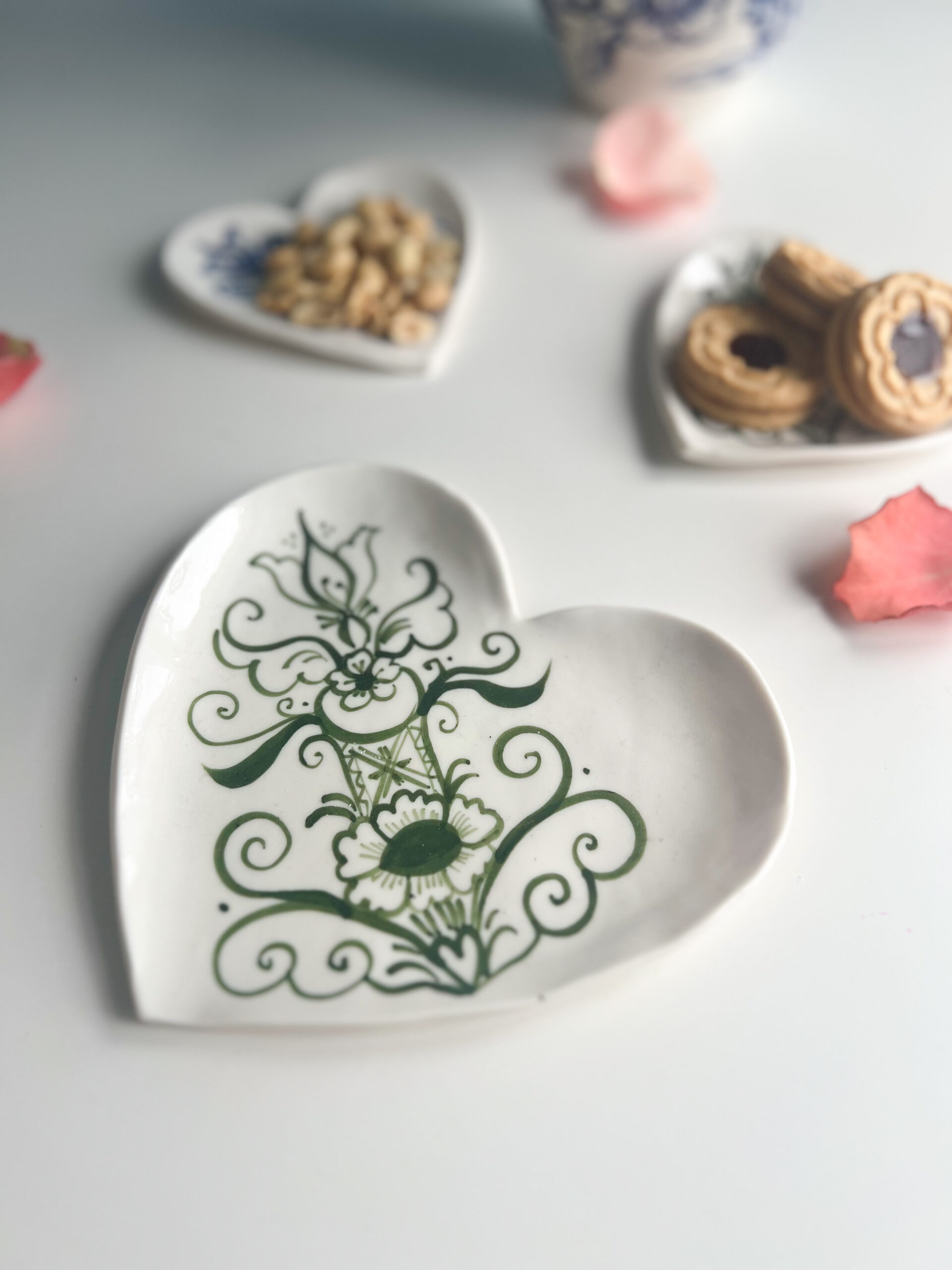 hjärtformade fat med gröna handmålade kurbitsmönster från Studio Kurbits