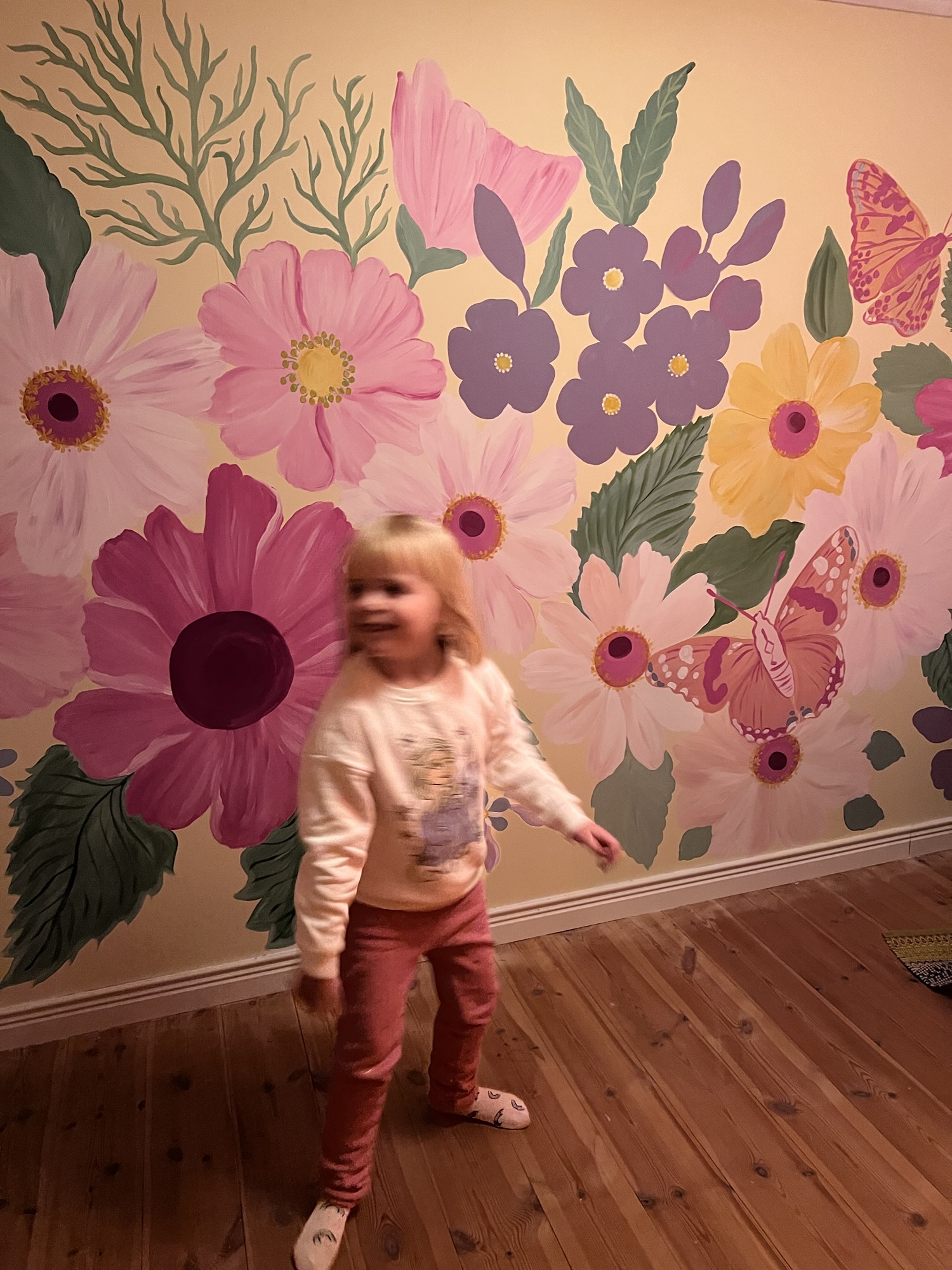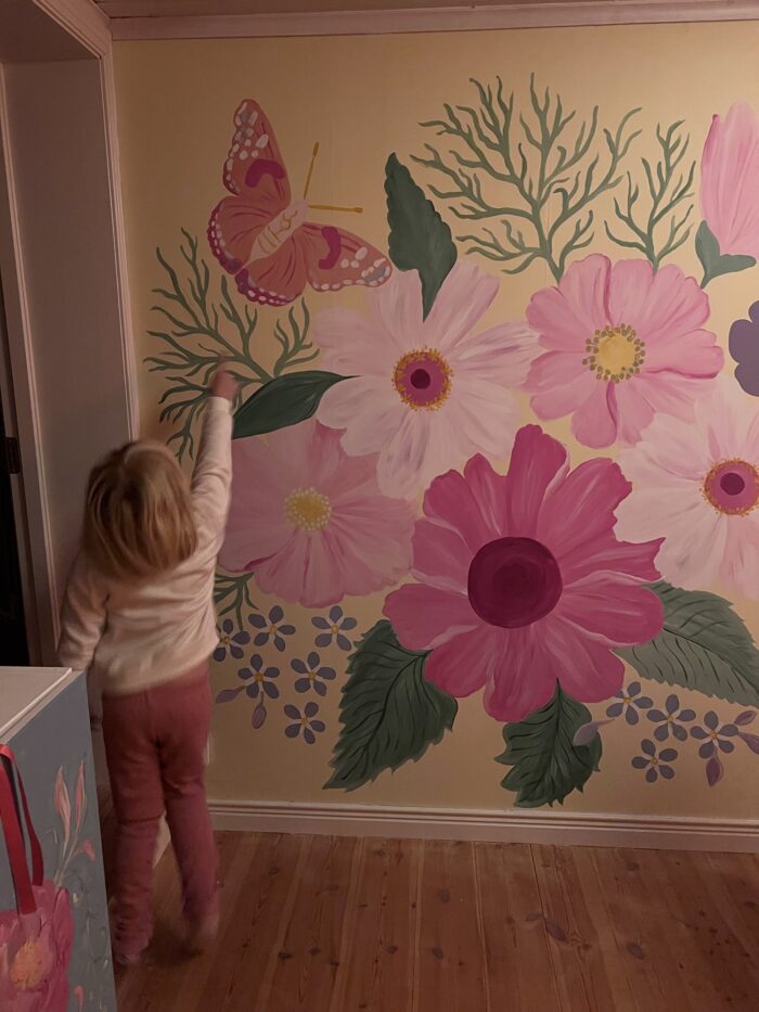 Under sommaren 2025 fick min dotter fjärilslarver av min vän för att föda upp och hon, 4,5 år var så himla engagerad. Hon älskade sina fjärilar och fångade även några egna larver i vår trädgård. Hon fotar också väldigt gärna blommor och växter så jag tog hennes foton på fjärilar och blommor och ritade en design till hennes rum. Det var så himla roligt att måla denna och anpassa kring de färger hon gillar- Vill du ha en målning gjord i ditt hem eller på ditt kontor- helt utifrån era idéer so jag omsätter i design och sedan målar- då får du höra av dig. Berätta, Vad skulle du vilja ha målat?