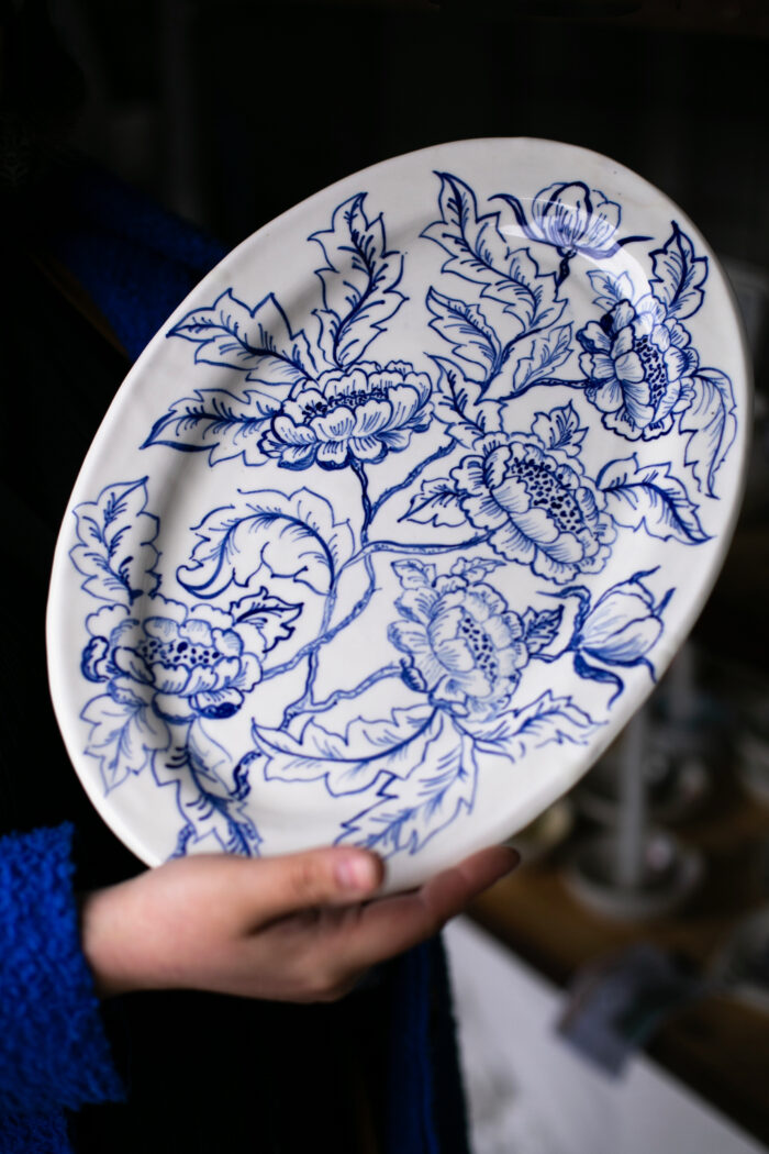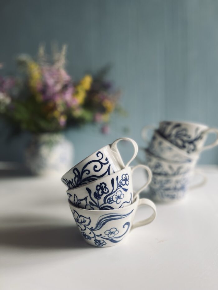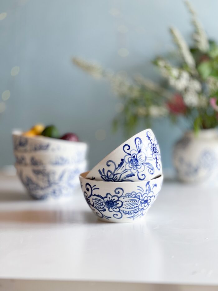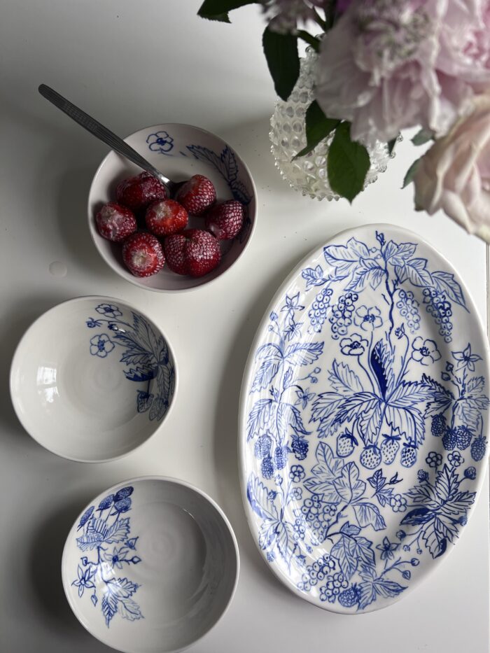 Min blåvita keramiken var nog det som lockade mig till materialet från början och det som blivit mitt signum som keramiker. Jag verkar inte kunna sluta skapa unika föremål i denna färgkombination, de är så klassiska, tidlösa och fina ihop med olika mat, de lyfter riktigt inredningen på matbordet. Mönstren är alltid unika på varje föreål och jag älskar att se vart penseldragen tar mig i stunden.