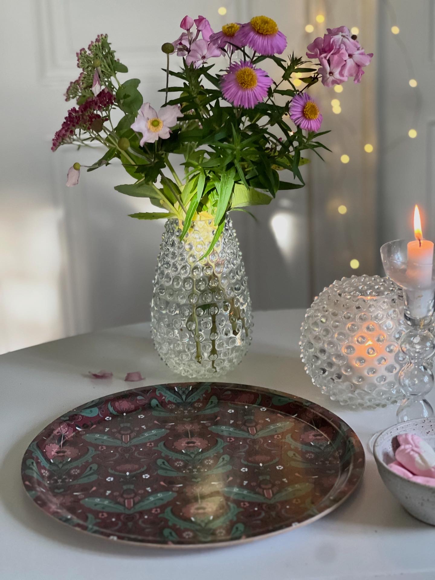 Mått 31 cm i diameter. Mönstret på brickan är handmålat digitalt av Pernilla Wetzel och tillverkad av björkfaner på ett företag på Öland. Brickorna tillverkas med en Melaminbaserad skyddande yta som gör ytan lite blank. Varje bricka har flera lager faner, som fogas samman med hjälp av lim, detta syns på den randiga kanten. Det trä som används till faner kommer ifrån antingen FSC- eller PEFC-certifierade leverantörer. Det innebär att ingående trämaterial kommer från skogar som brukas långsiktigt och ansvarsfullt.