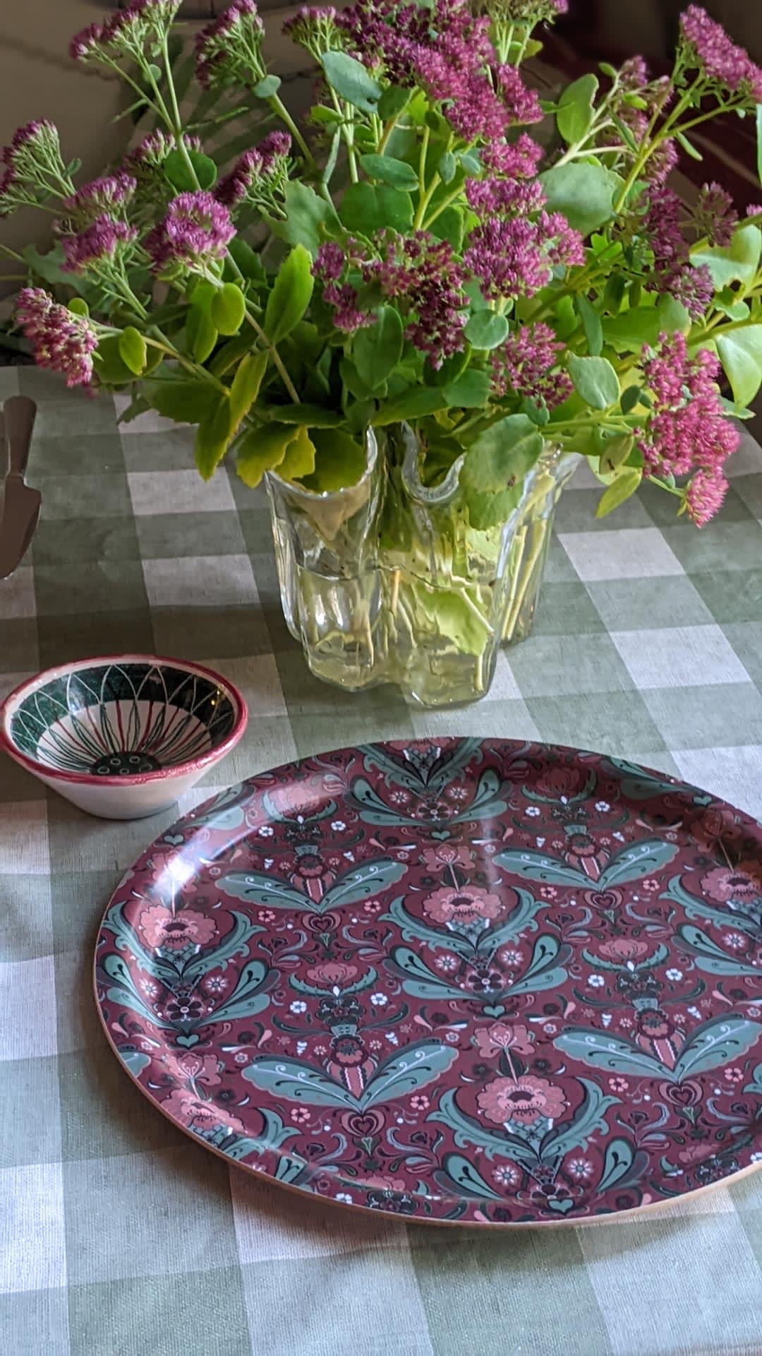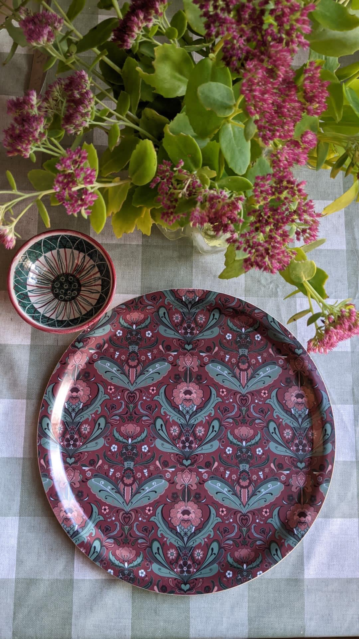 Vacker bricka med ett härligt kurbitsmönster med mörkt julröd/ Dalarö botten med en riktigt julig känsla i gröna och djupt röda toner. Denna bricka passar perfekt åter om, men extra nu till hösten och vinterns fikor tillika att använda som glöggbricka eller för att samla kökets attiraljer på i en fin grupp. Storleken på 31 cm i diameter gör den perfekt att använda även som tårtfat. Vacker också som inredningsdetalj lutad mot kökskaklet tillsammans med skärbrädor, krukor eller andra inredningsdetaljer.