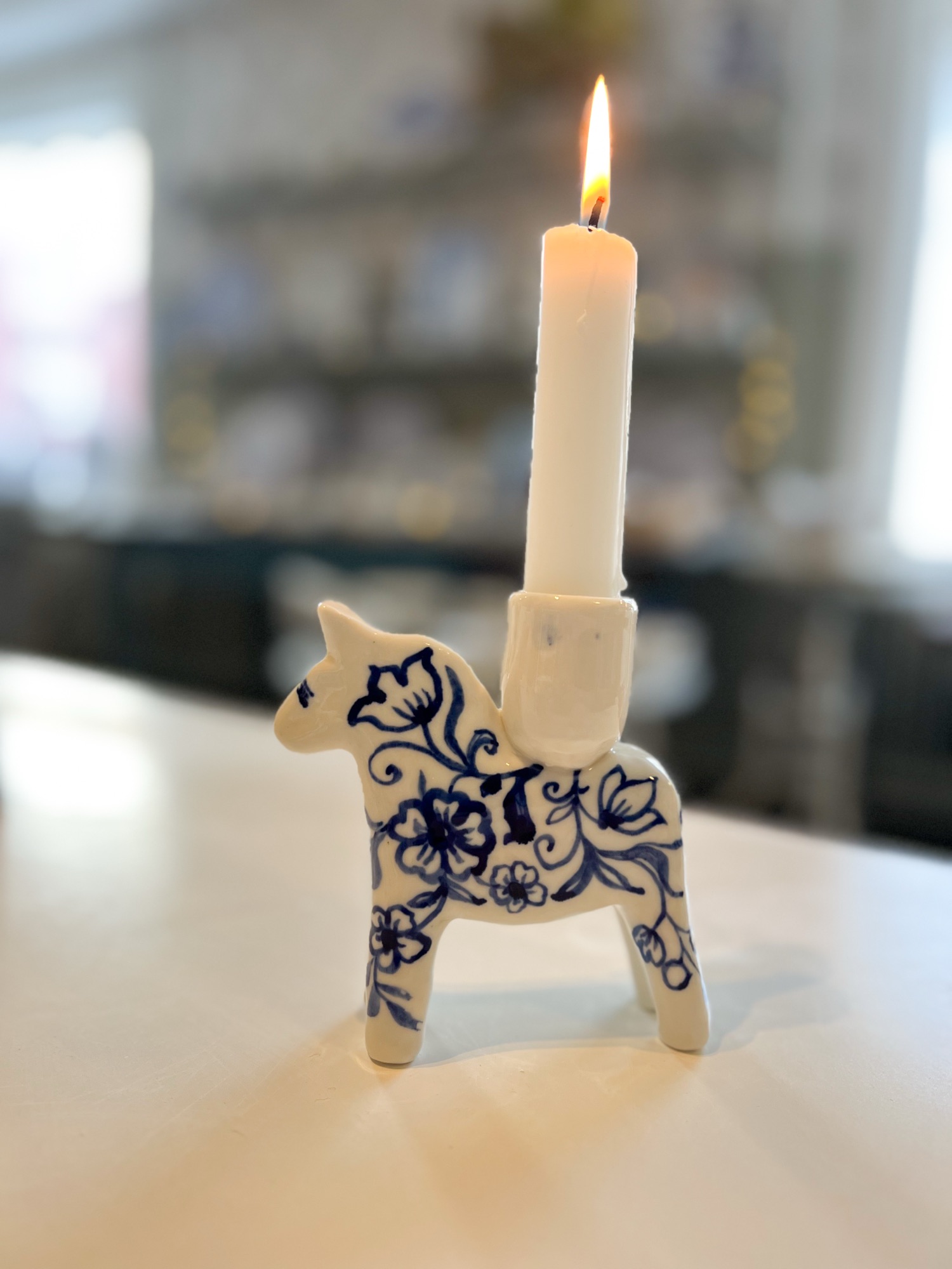 Handbyggd ljusstake i porslin med vacker blå handmålad dekor. Unikt exemplar