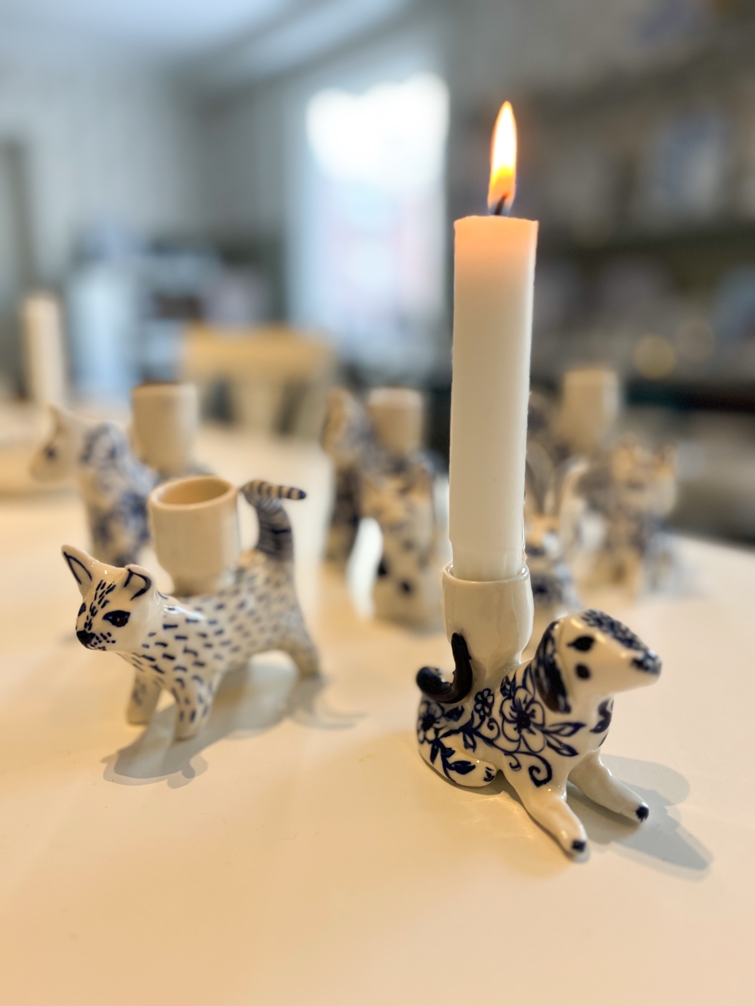 Handbyggd ljusstake i porslin med vacker blå handmålad dekor. Unikt exemplar