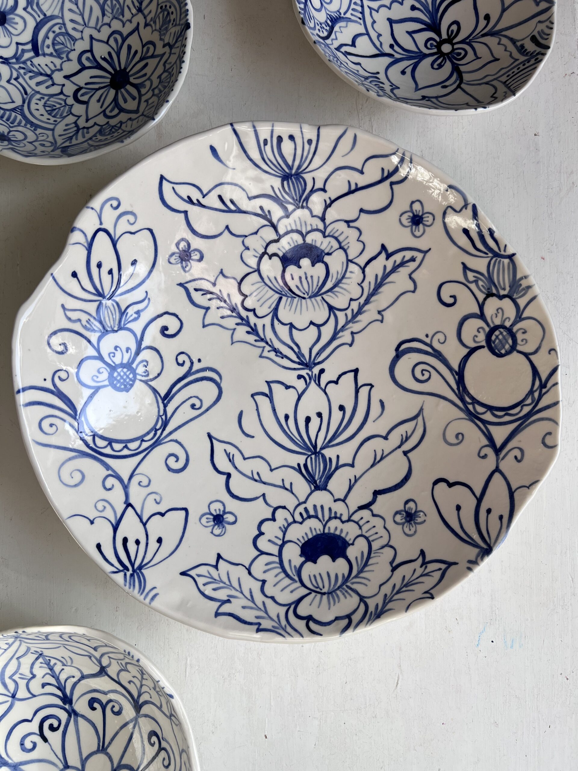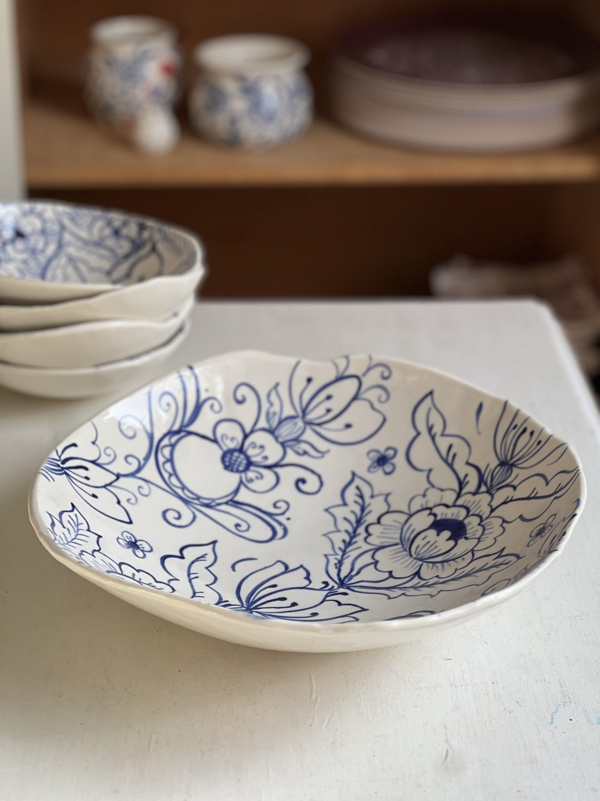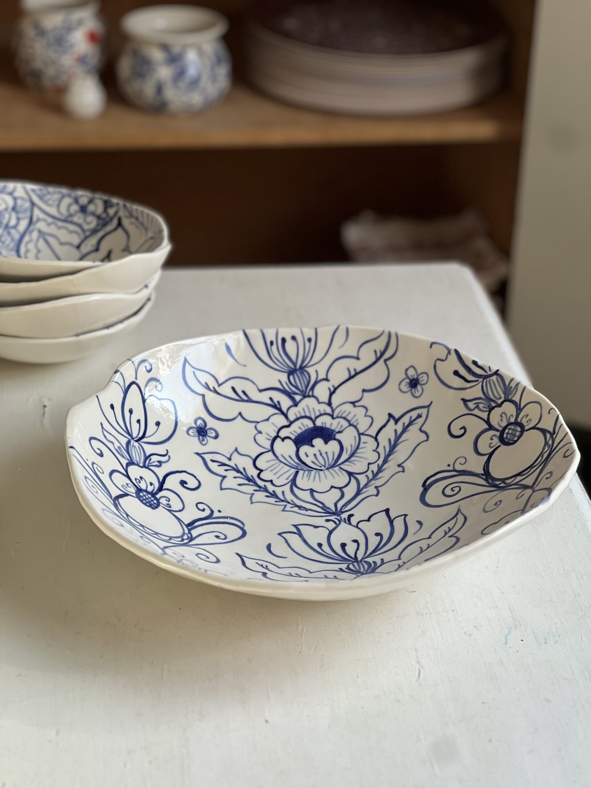 Vacker stor skål som förgyller alla middagsbord som en otrolig centerpiece. Skålen är skapad för hand i vacker, vitporslinslera och fungerar lika bra till salladen som chipsen eller frukten som en conversationpiece helt för sig själv. Mönstret är handmålat och det är ett unikt exemplar med sitt eget rapporterade mönster i vackert blått: Skålen har medvetet fått en härlig organisk, böljande form. En perfekt krock mellan klassisk blåvit keramik och spännande moderna former.