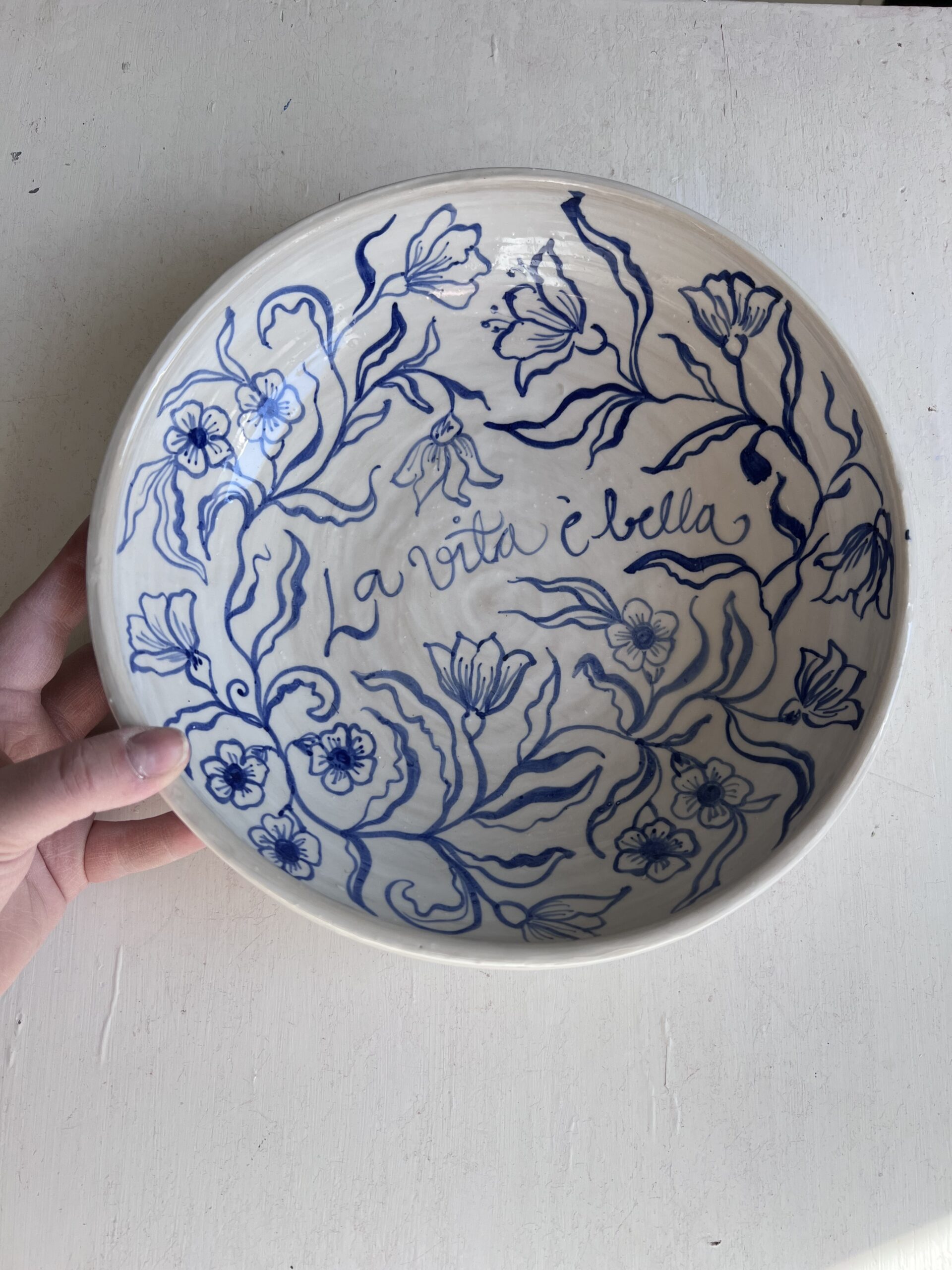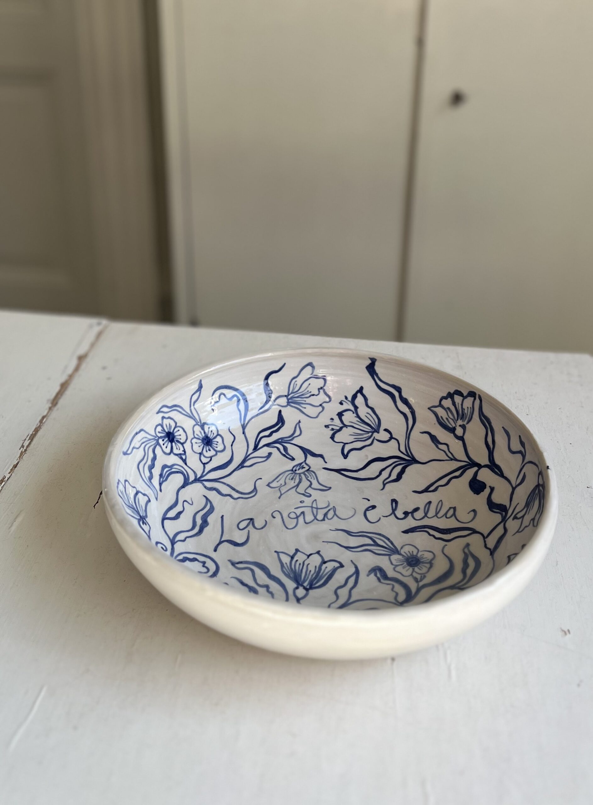 Vacker rejält stor skål som förgyller alla middagsbord och för tankarna till Italien med ditt fina budskap i botten; La Vita é bella- livet är underbart. Skålen är drejad i stengodslera och har sedan målats med vit porslinsengobe för att få en vacker vit yta. Mönstret är handmålat och det är ett unikt exemplar med sitt eget mönster.