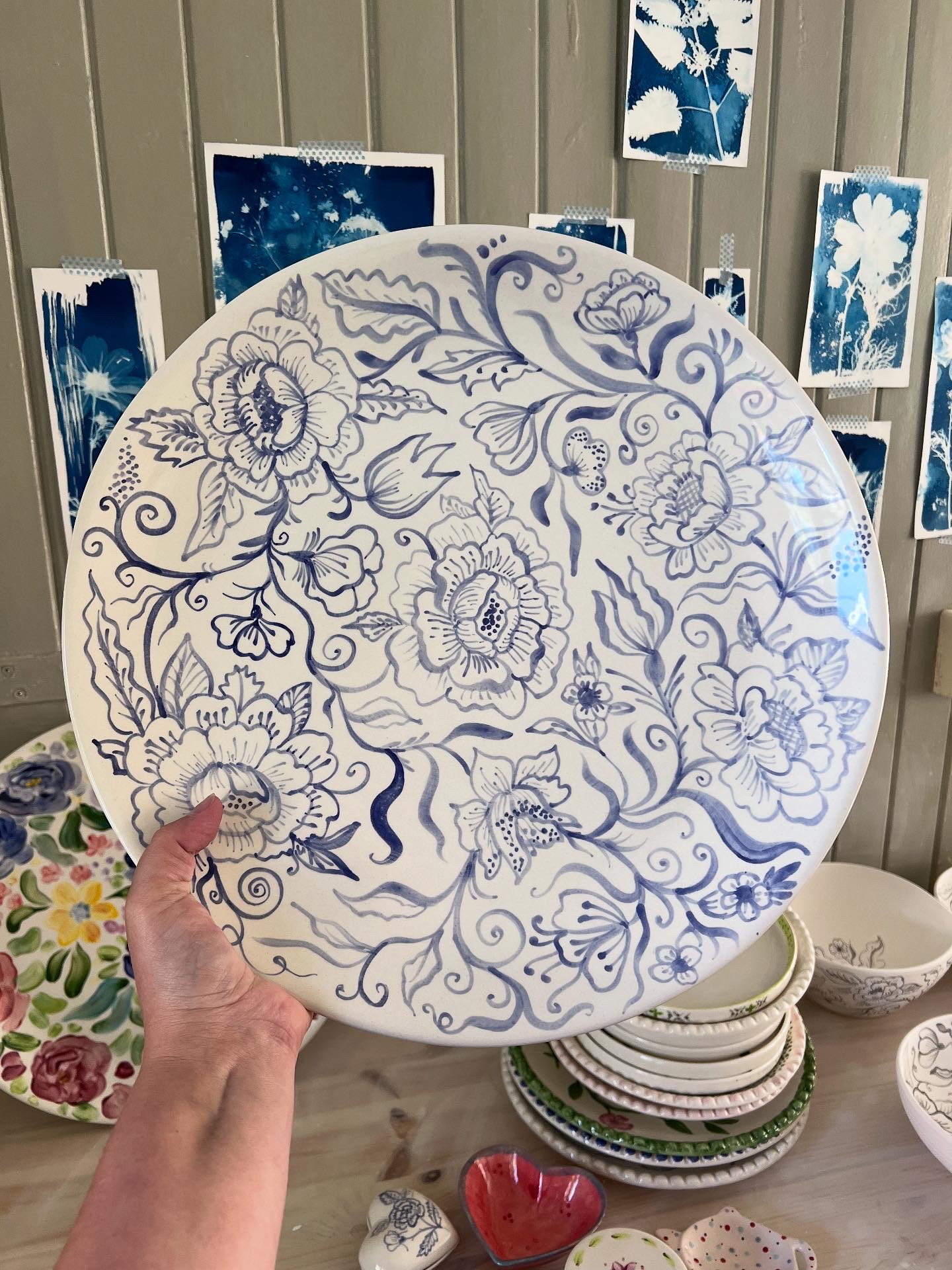 Ett vackert och unikt stort fat som målats för hand med ett vackert blått blomstermönster. Endast ett i sitt slag.