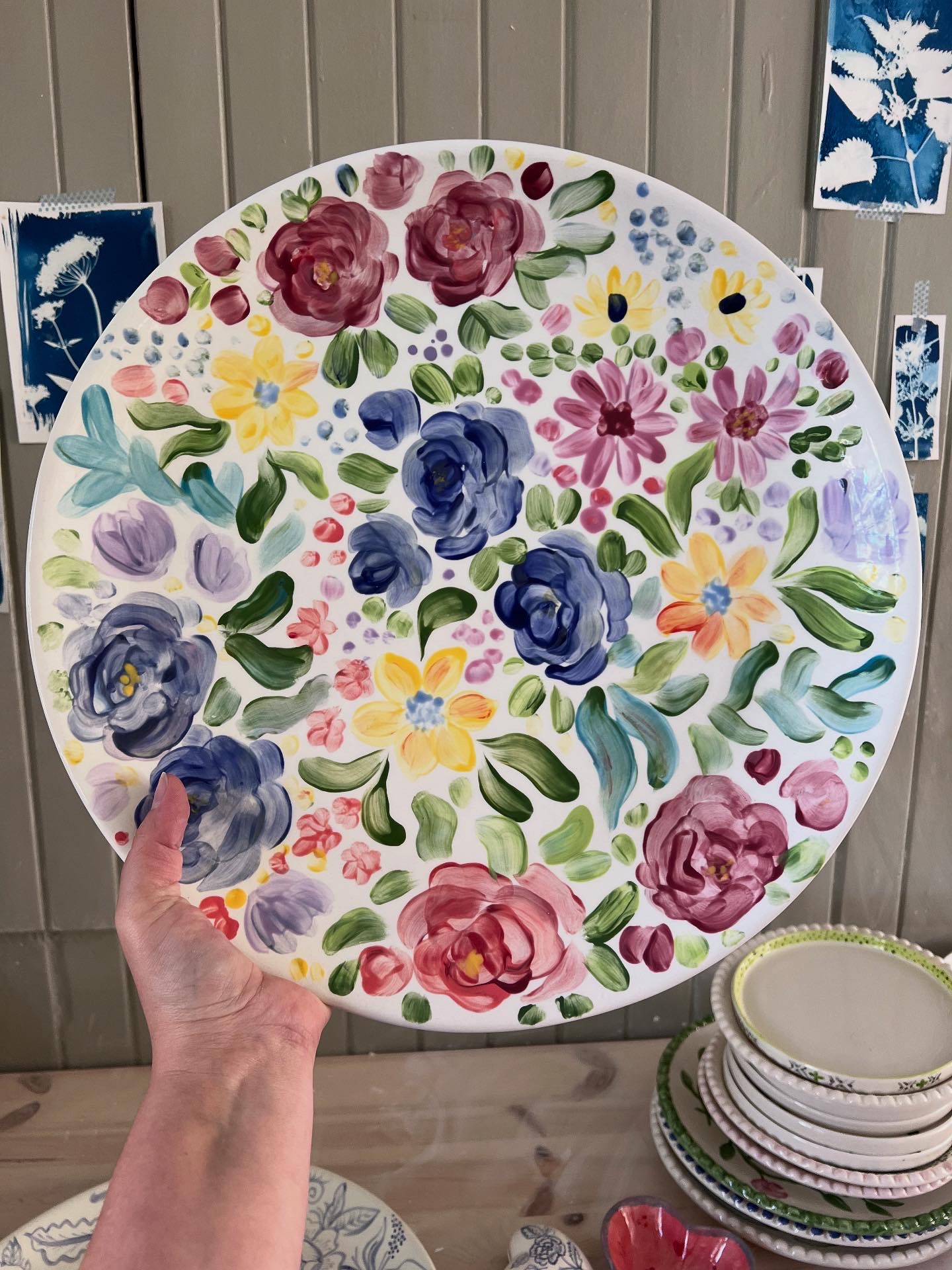 Ett vackert och unikt stort fat som målats för hand med ett vackert färgglatt blomstermönster. Endast ett i sitt slag.