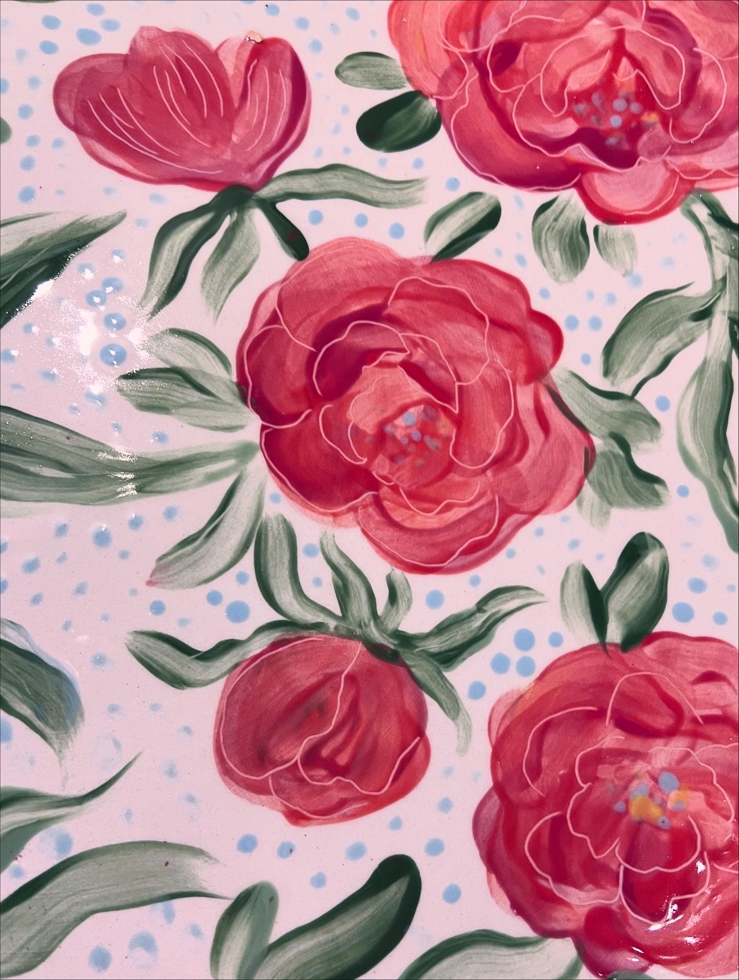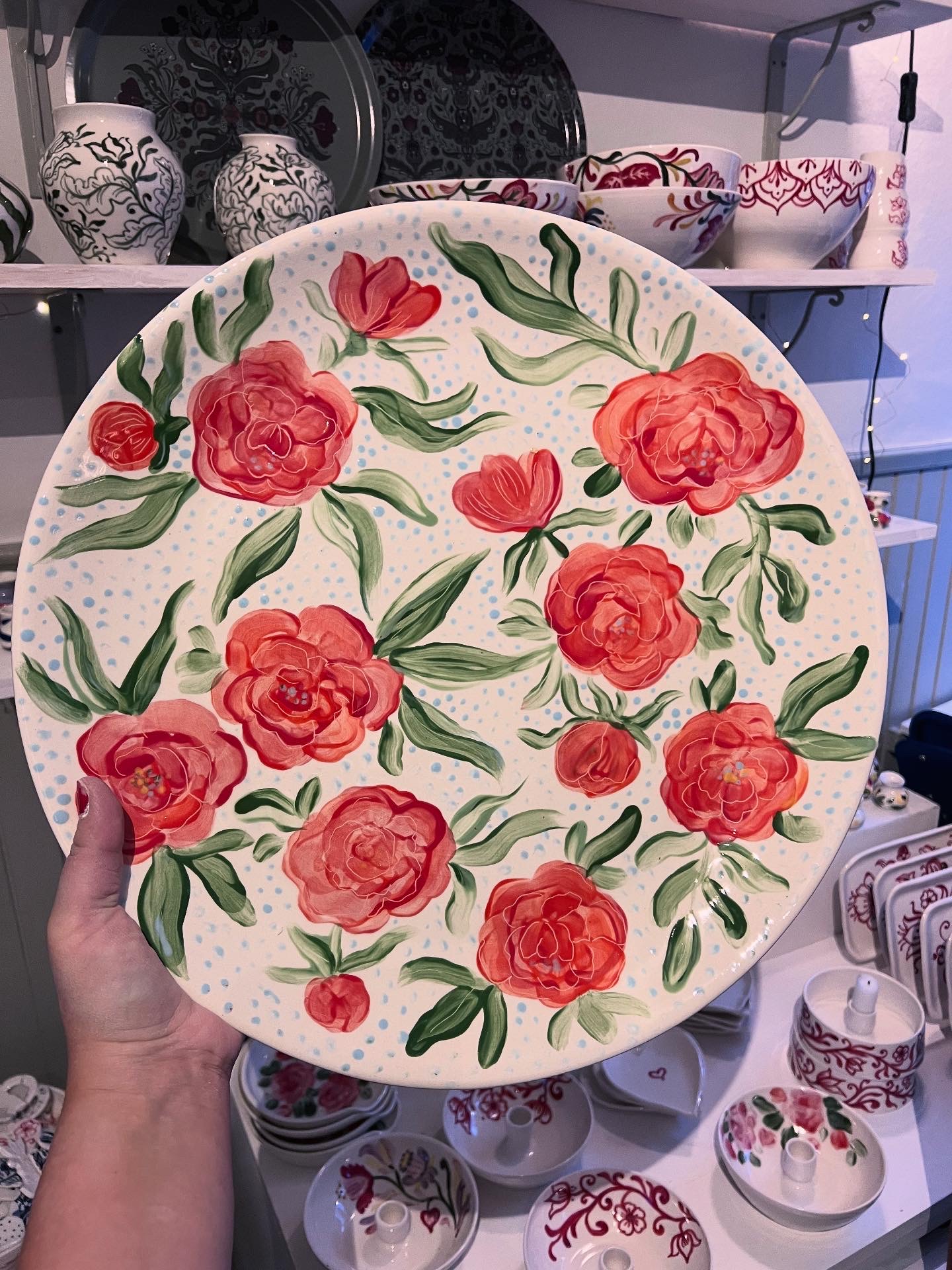 Ett vackert och unikt stort fat som målats för hand med ett vackert rosmönster i röda och gröna toner. Endast ett i sitt slag.